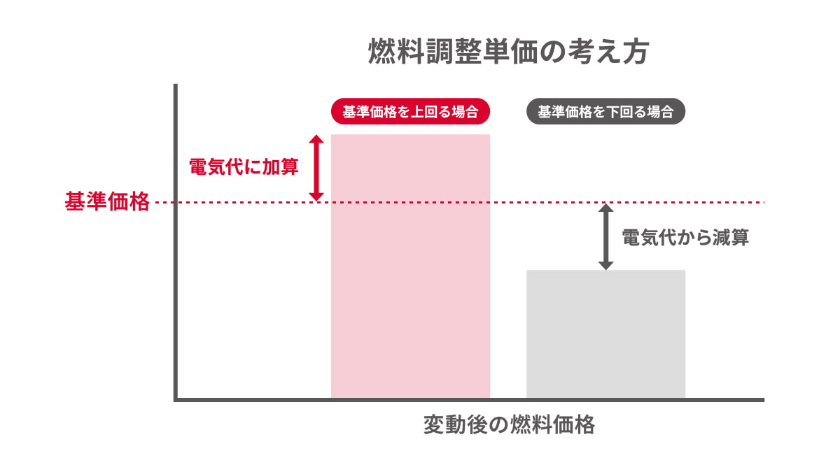 「燃料費調整単価」は、火力発電の燃料価格の変動に応じて変動します。燃料費調整単価には基準価格が設けられており、その変動によって基準価格を上回ると加算、下回ると減額される仕組みです。