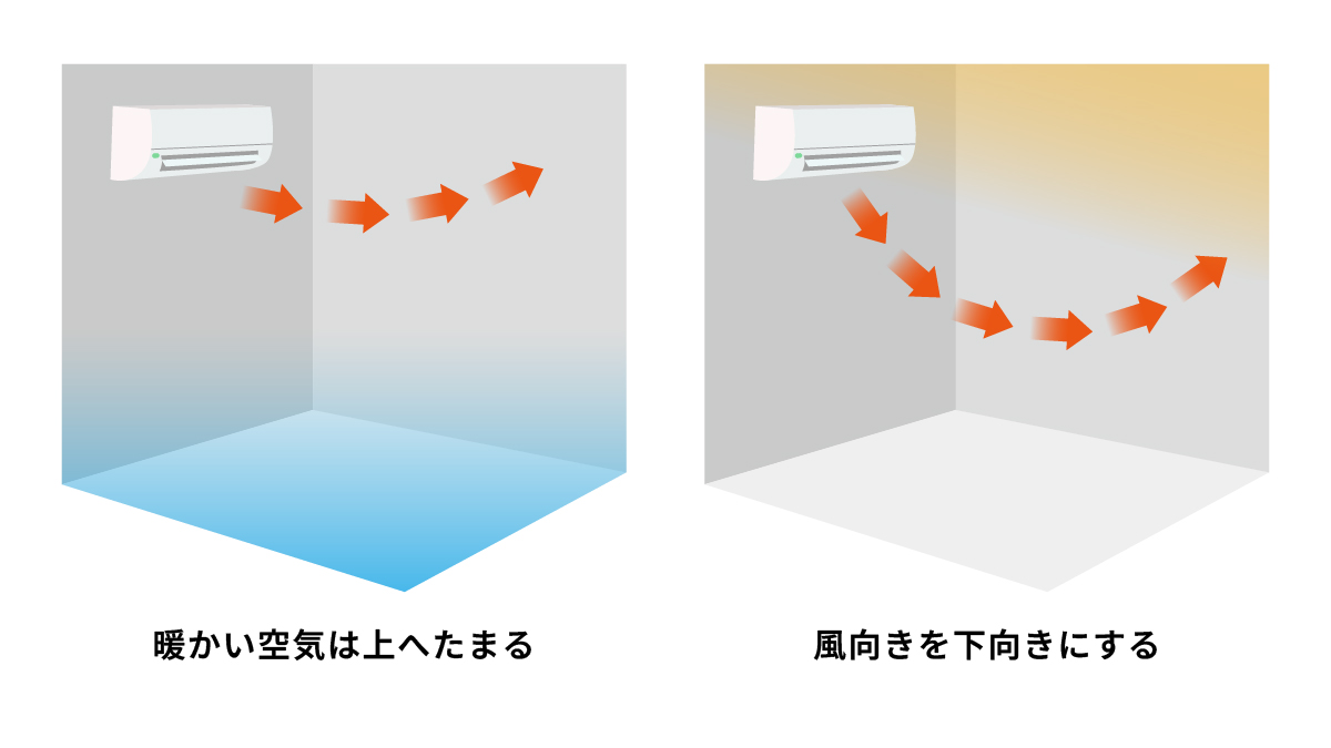 暖かい空気は上へ、冷たい空気は下へ移動する性質があります。そのため、エアコンの暖房を使用する際は、風向きを「下向き」に設定しておくことが大切です。こうすることで、暖気が足元から広がりやすくなり、効率的に部屋を温められます。