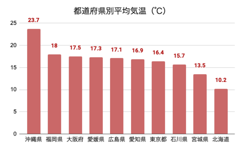 例えば、外気温が低い地域では設定温度を高めにしなければ快適な室温を維持できません。総務省統計局のデータによると、都道府県別の平均気温は以下の通りです。