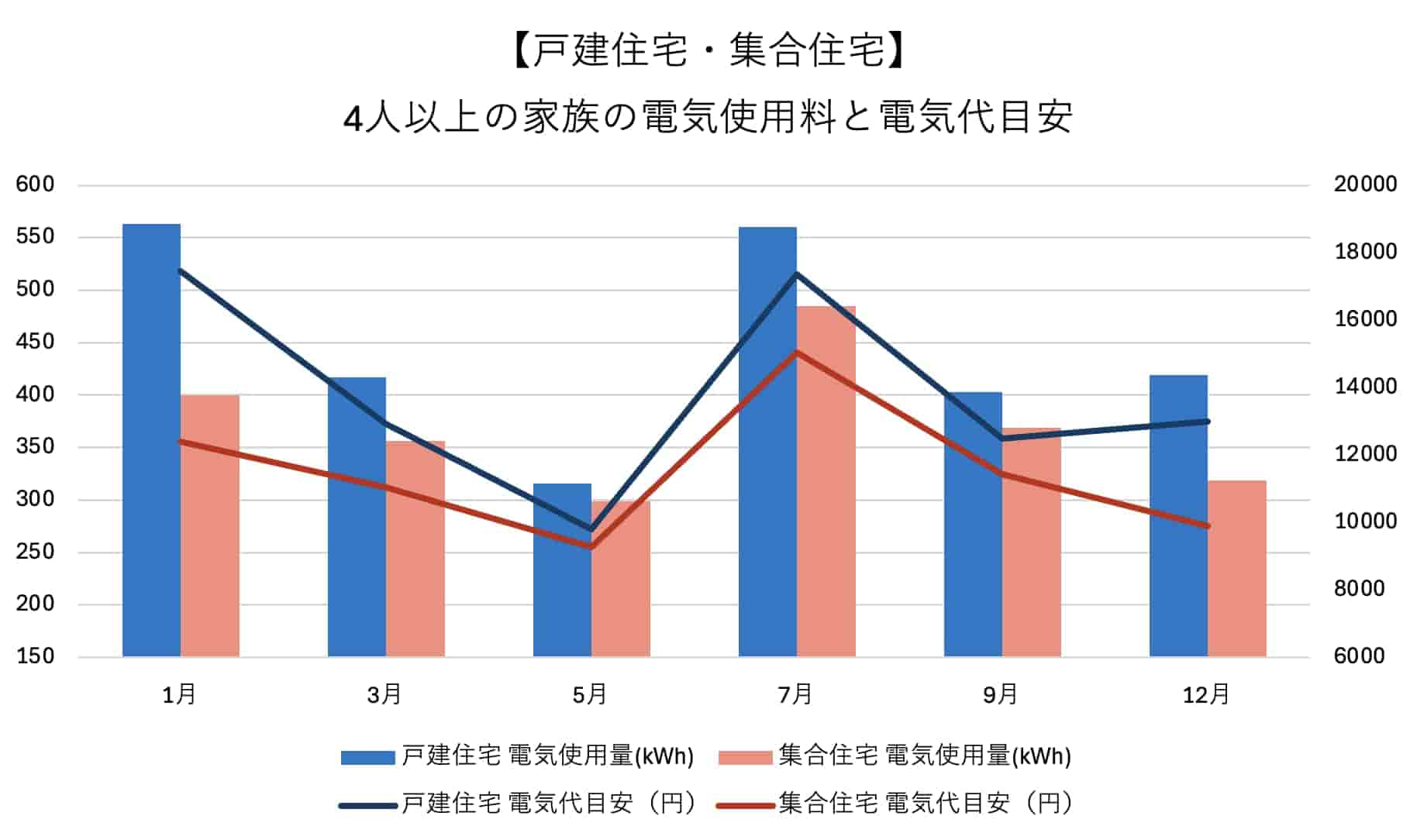 例えば、4人以上の家族の電気代を戸建住宅と集合住宅で比較すると、以下のような違いが見られます。なお、電気代は、全国家庭電気製品公正取引協議会が定める目安単価「31円/kWh」に基づく数値です。