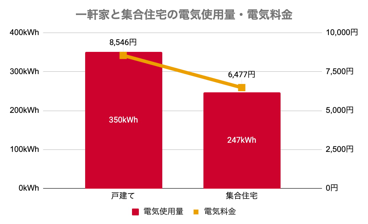 一軒家の電気使用量は平均350.2kWh、電気料金は平均8,546円です。一方、集合住宅の電気使用量は平均246.6kWh、電気料金は平均6,477円で、一軒家と2,000円程度の差となっています。