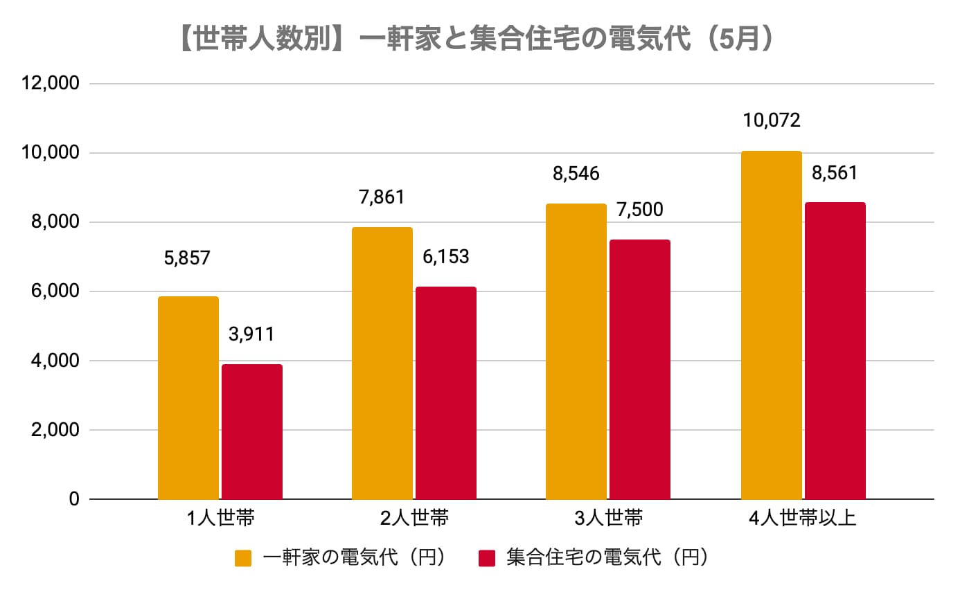 すべての世帯人数で、集合住宅より一軒家の方が電気代は高い傾向にあり、1,000〜2,000円ほど一軒家の方が高くなる結果です。