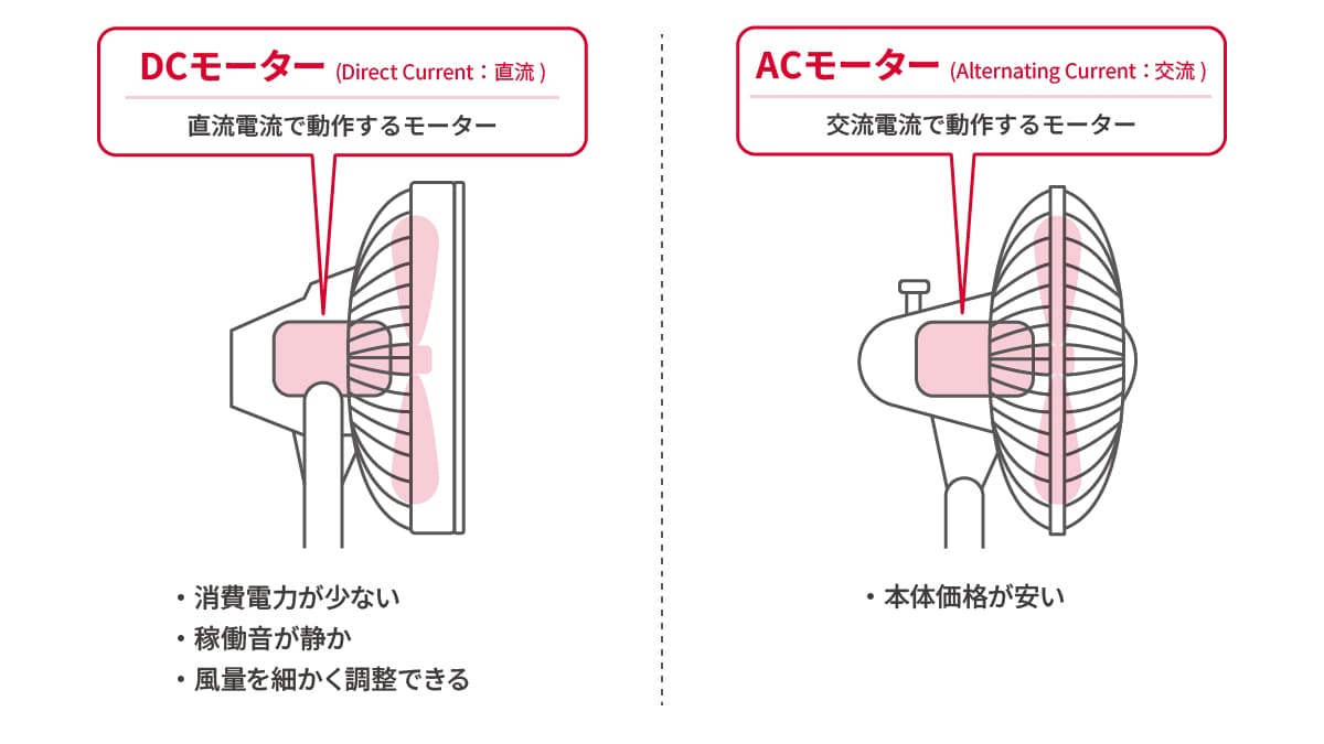 扇風機に搭載されるモーターは大きく分けて、バッテリーなどの直流電源で動く「DCモーター」と、家庭のコンセントから供給される交流電源で動く「ACモーター」の2種類があります。搭載されているモーターによって、消費電力や電気代が異なります。