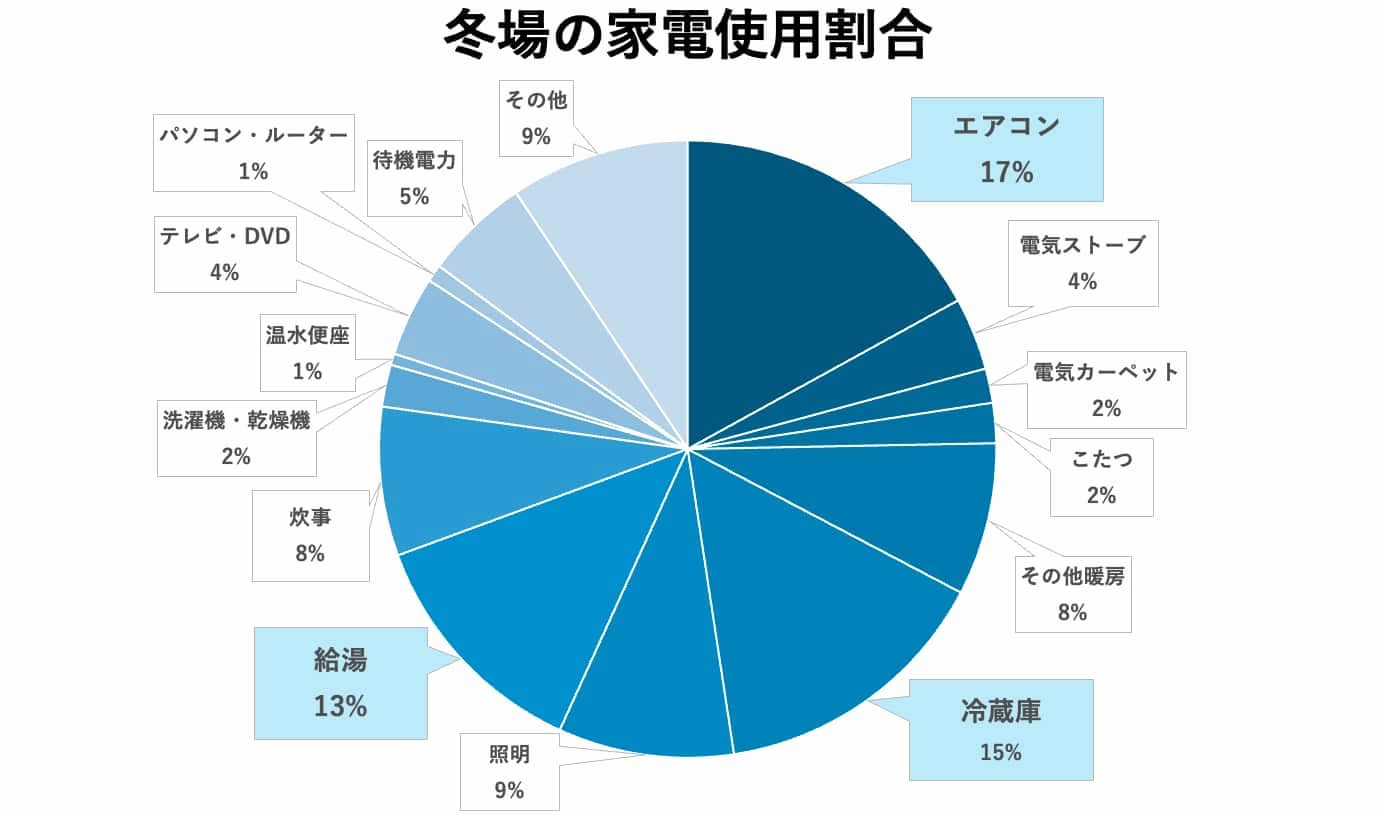 経済産業省 資源エネルギー庁の資料によると、冬の給湯器による電力消費は、家庭全体の約12.6%を占めるとされています。給湯器は外の空気の熱を利用してお湯を作るため、気温が低いと消費エネルギーが増える仕組みです。