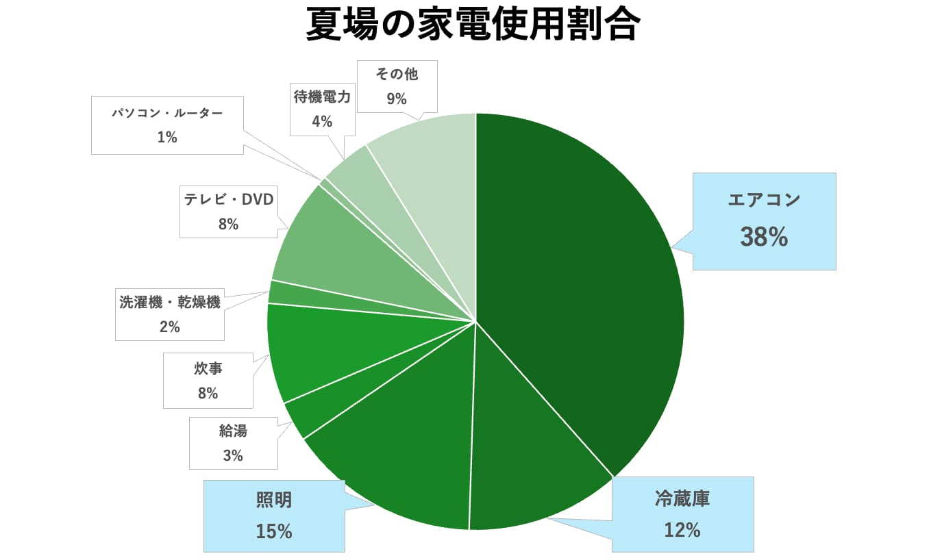 また、家電の電気使用量は季節による違いもあるため、電気代が高くなりやすい家電をチェックしておくと節電しやすいでしょう。例えば、夏場はエアコンや冷蔵庫、冬場は暖房器具の使用率が高まり、電気代の大きな割合を占めます。