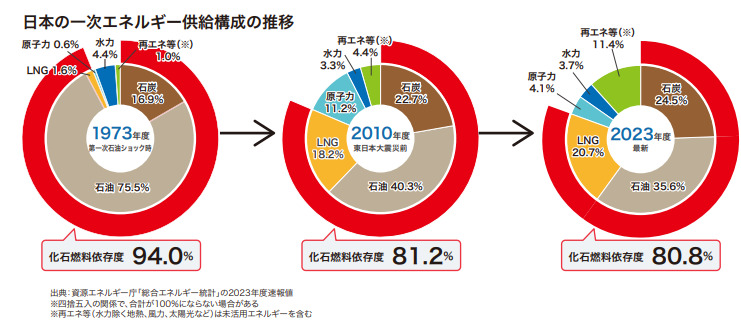 日本では再生可能エネルギーの導入が進んでいるものの、2023年度時点でも依然として化石燃料への依存度は8割以上と非常に高い水準にあります。50年前と比較すると、再生可能エネルギーの比率は増えましたが、発電の大部分を化石燃料に頼っている状況は変わっていません。