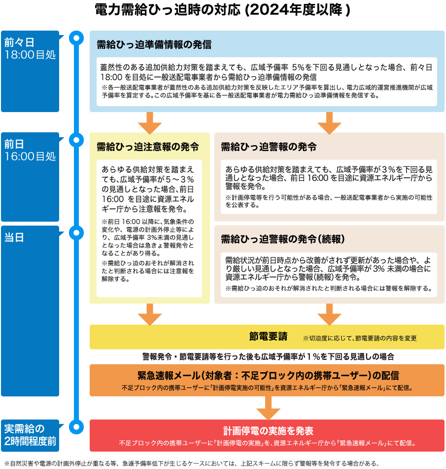 なお、2024年度以降は、電力の予備率が9つのエリア(北海道・東北・東京・中部・北陸・関西・中国・四国・九州)を一括りにした広域で1%を下回った場合、緊急速報メールが配信され、計画停電が実施される仕組みも導入されています。