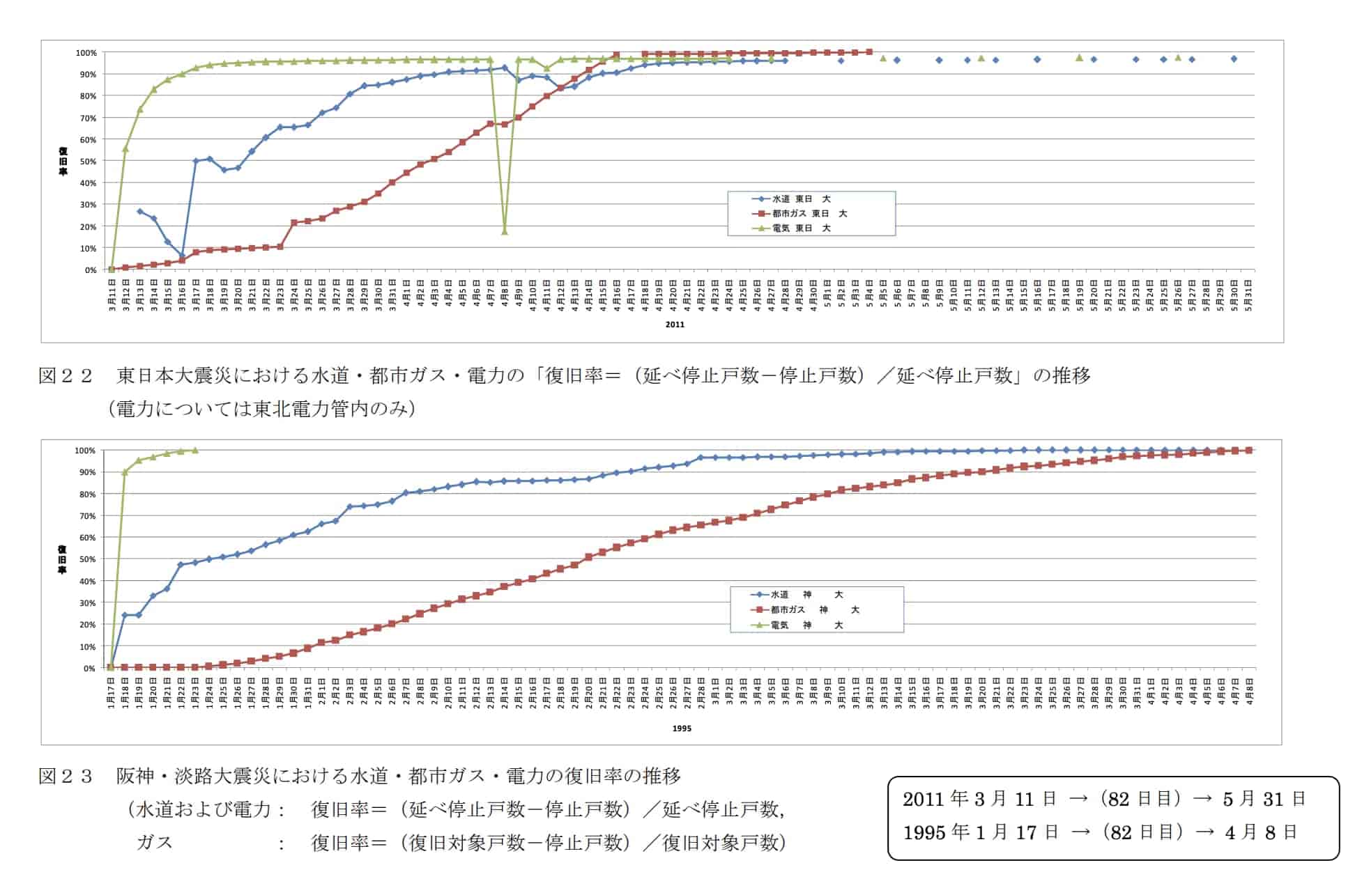 また、災害時において、電気は水道やガスよりも早期に復旧する傾向にあります。実際に、東日本大震災や阪神・淡路大震災でも、電気が最も早く復旧しました。