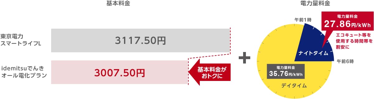 idemitsuでんきの「オール電化プラン」なら地域の電力会社より基本料金が安価になります。さらに車にお乗りの方は、年間最大2,400円も追加でおトクです。