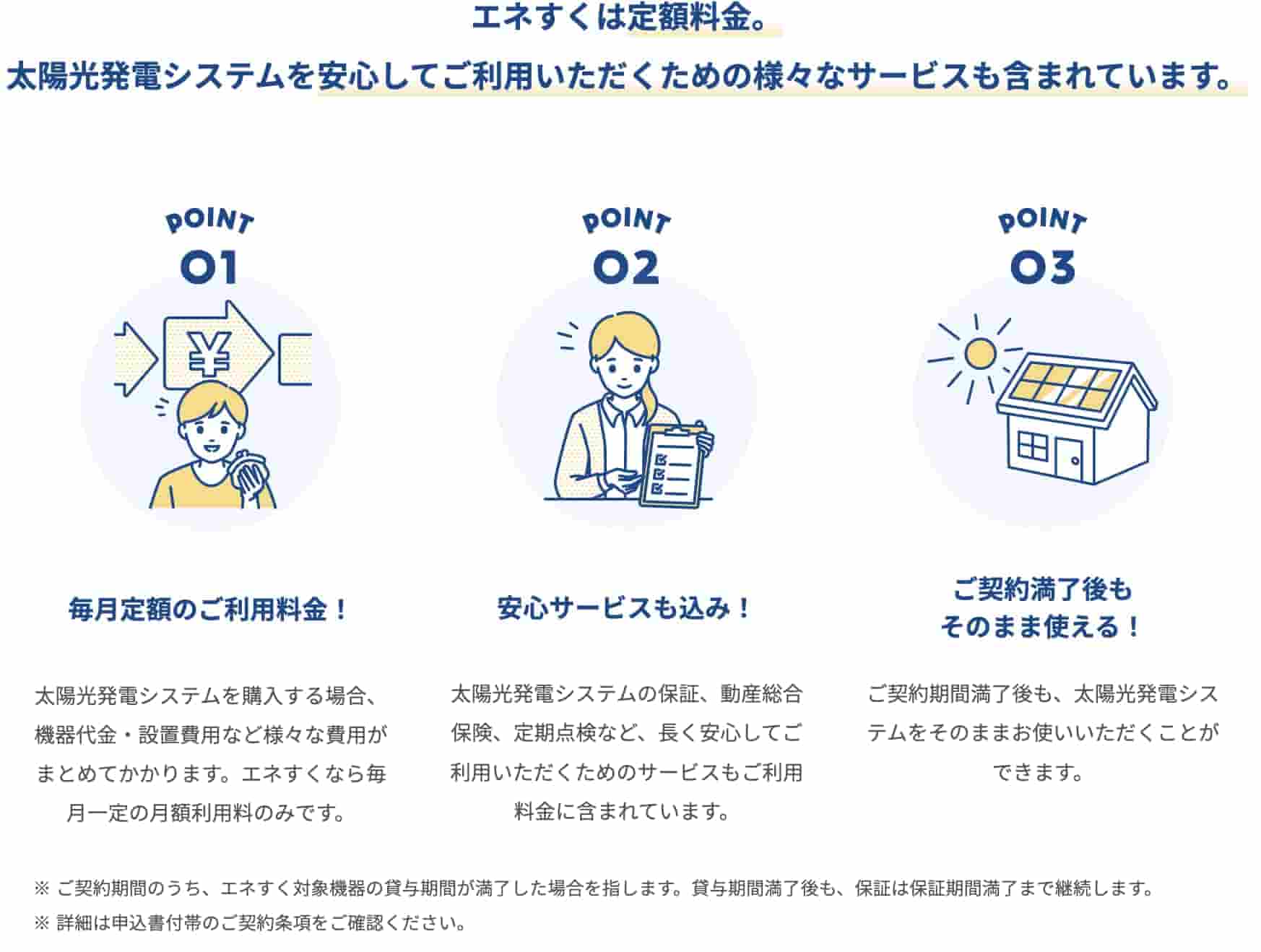 さらに、オプションで蓄電池もセットで導入可能です。契約満了時には設備が譲渡されるため、そのまま使用できるメリットもあります。定額料金には機器の保証や定期点検、動産総合保険の費用が含まれるため、故障やメンテナンスの心配も不要です。