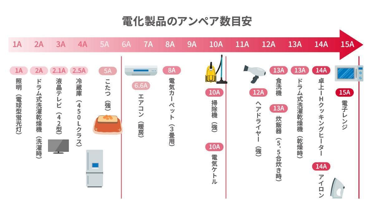 各家電のアンペア数の目安については、以下の画像を参考にしてください。